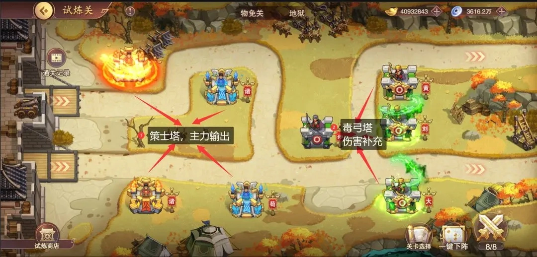 在魔免关卡中,所有怪物都会拥有法术免疫的特性。主公在进行布防时,需要上阵步兵塔、弓手塔和炮兵塔,这样才能有效应对该关卡的环境。