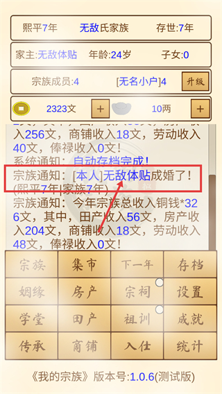 4、收到【宗族通知】显示【无敌体贴成婚了】,宗族成员增至4人,后续可继续推进宗族的发展进程。