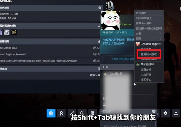 4完成上述操作后,按下【shift+Tab】组合键即可调出Steam的好友列表,在列表里找到目标好友,点击该好友后选择【邀请加入游戏】选项,就能向对方发出游戏邀请了。