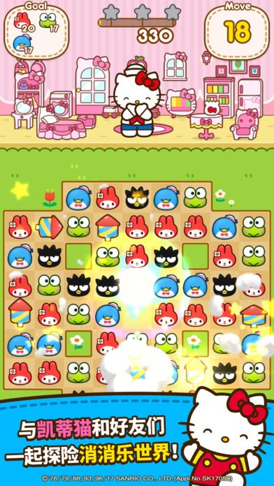 在消除方块障碍的过程中收获乐趣,同时探索凯蒂猫与她朋友们的奇妙世界吧!