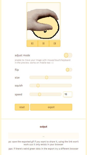 petpet generator是一款超棒的解压休闲小游戏,短短几秒就能生成趣味表情。你可以用触碰来完成摸头互动,还能自由绘制图案、用手捏弄它,过程解压又有趣。所有功能都是免费的,任何图片都能拿来使用,快一起发挥想象力,放松心情吧!