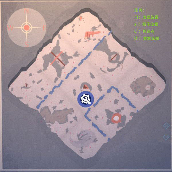 这张图在六张图里资源最匮乏,地图边缘只有五处有地形,西北、东北和南边各只有一个地堡,完全没有箱子。西北和东北的炸桥点附近还各有三只狼,西北是三只白狼,东北是三只黑狼,打野挖宝时稍不注意就容易阵亡。