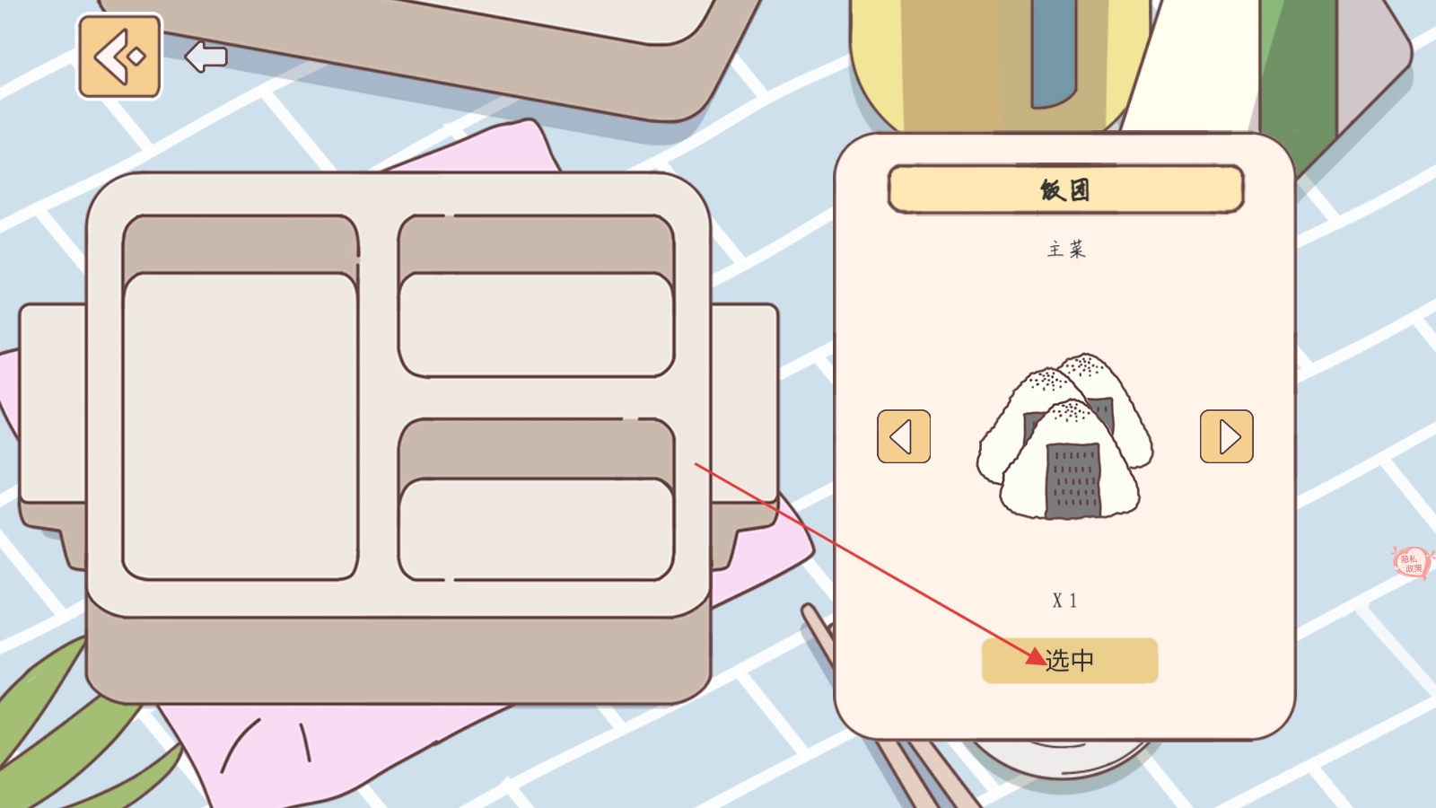 3、进入饭盒界面,点击【选中】饭团等食物装便当。