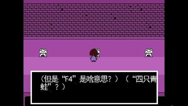 4在北侧藤蔓缠绕的房间里会遭遇名为froggit的青蛙,此时选择“行动”选项中的“赞美”,尽管青蛙并不理解你的话语,却会因此变得愉悦并主动退出战斗。右侧水池区域设有尖刺机关,Toriel会牵起你的手带你安全穿过这片危险地带。