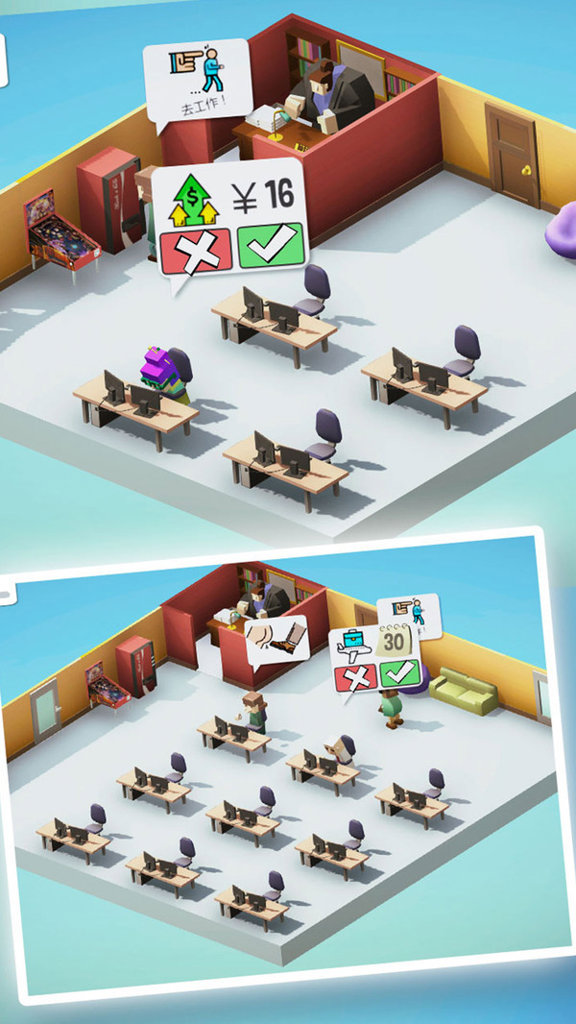 这是一款极具创意的游戏,画面简约但可玩性颇高。在游戏中,玩家需要悉心关照每一位员工的情绪,使他们能够安心为你效力。