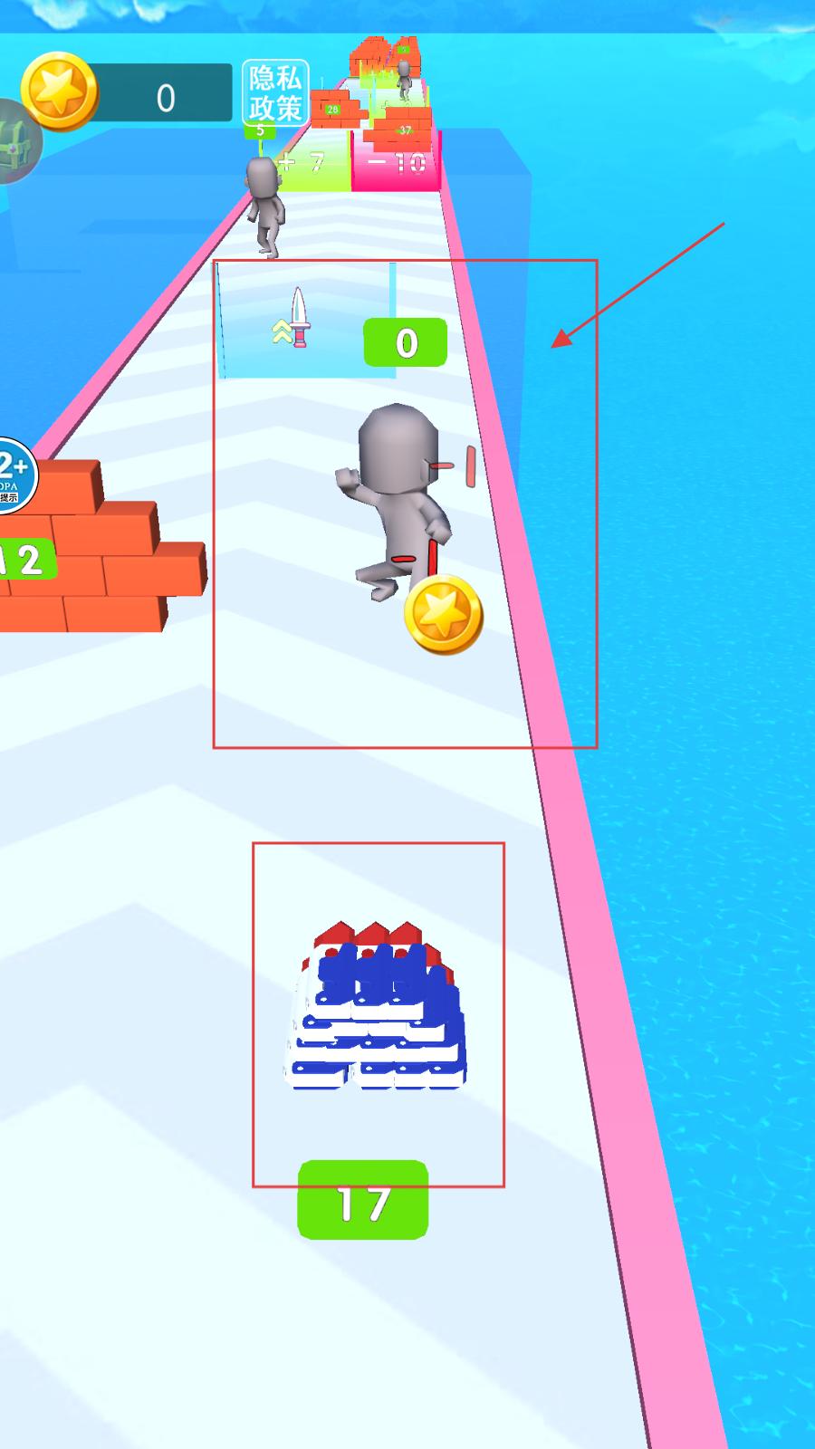 2、玩家进行跑酷时,能够指挥人群撞破砖块、拾取星星,遇到敌人时优先发起攻击,保持队伍的规模,不断推进关卡的进度。