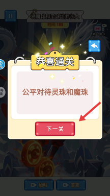 4、通关后会出现【公平对待灵珠和魔珠】的提示,点击红色的【下一关】按钮就能继续挑战后续关卡。