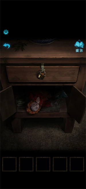 2、首先左边柜子的第二层放着一个洋娃娃,它的胸膛部位需要用到螺丝刀,但我们目前还没有这个工具。