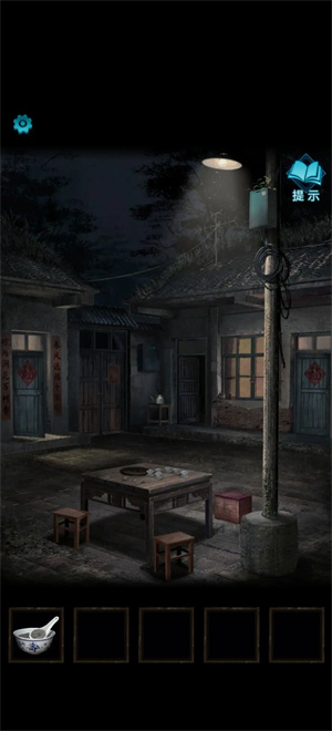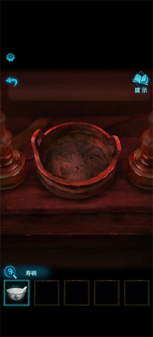 6、总而言之,打开抽屉取出碗和勺子后,发现神龛下方的香炉有提示说里面藏着东西。于是用碗把香灰舀出来,这样就得到了一碗香灰和香灰铲。你瞧这把铲子,又长又扁的形状,正好能用来挑开门栓呢。