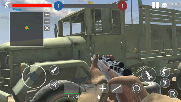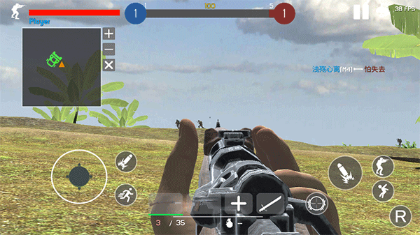 7、进入游戏后,通过左边的摇杆来实现移动,滑动屏幕可控制方向。右侧自左向右依次排列着瞄准、开火、站立/下蹲、跳跃、换弹等按钮。