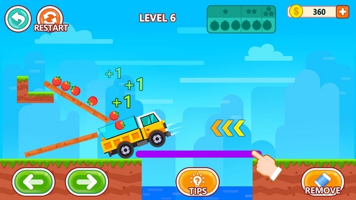 1通过在屏幕上绘制线条,为小卡车搭建能跨越不同地貌的路径,确保所有新鲜的水果与蔬菜都能完整地被收集到车厢中。