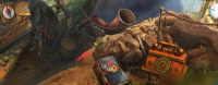 2. 继续用扳手操作,就能获得【水晶】。把右侧的消防栓和喷水池通过软管连接起来,然后点击消防栓进行排水。接着在喷水池里使用充好电的鱼,等所有小螃蟹都被鱼吃完,就会得到【机械兵部件3】。之后回到房子里,将机械兵损坏的头部、机械兵部件以及水晶都放到操作台上,按照右上角的图解放置好部件后,点击右侧的电焊枪,即可得到【机械兵的头】。