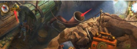 4. 和男人对话后,从水桶里拿到【鱼】,汽油桶上获取【线圈】,右侧门附近找到【勺底】。返回后,打开吊桥旁的木窗,在左侧墙壁装上灯泡得到【鱼叉】。把鱼放到浮标上再返回,用鱼叉对准浮标使用,最后从乌鸦窝里拿到【发夹】和【剪刀】。