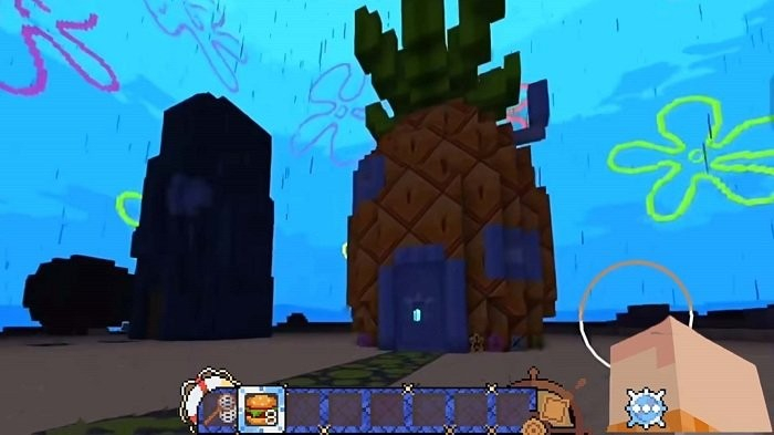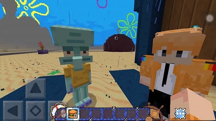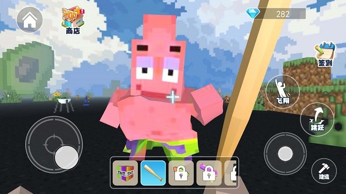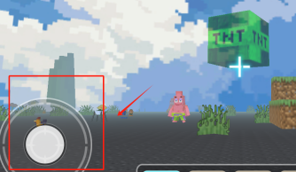 2、在像素场景中操控派大星移动,悬浮TNT可进行放置,按下圆形按钮能够调整视角。