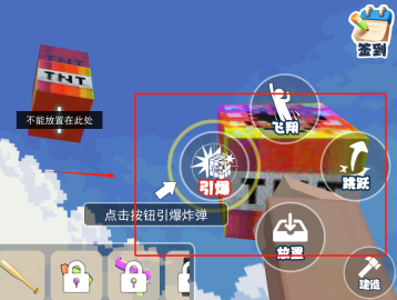 3、在屏幕下方挑选道具,右侧的按钮可用来操控飞翔、跳跃、放置以及引爆炸弹,要留意不能随意放置TNT。