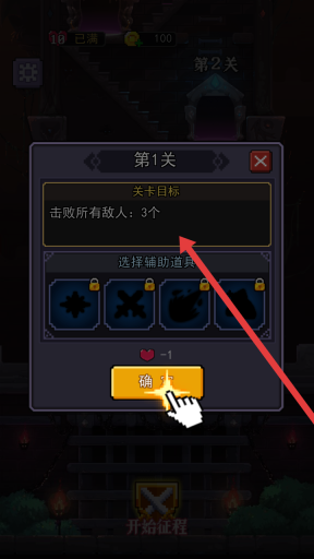 1、挑战第1关时,先确认关卡目标是击败3个敌人,然后点击黄色的确定按钮,消耗一颗心即可进入关卡。