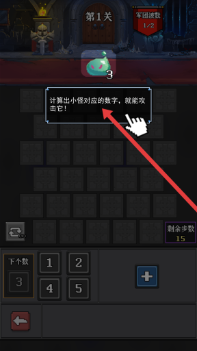 2、战斗阶段,按照提示算出小怪对应的数字,即可对其发起攻击。你可以借助下方的数字按键和运算符,计算出怪物头顶显示的数字,以此来发动攻击。