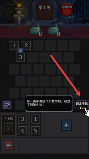 3、各关卡设有操作步数的限制,请注意观察右侧显示的剩余步数,必须在步数用完之前战胜敌人,不然就会判定该关卡失败。