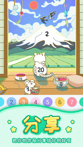 《数字填色二》是一款趣味十足的绘画涂鸦游戏,它巧妙融合了数字元素与涂鸦玩法。玩家只需对照图片上的数字进行涂色,操作十分简单。游戏内还提供了海量图片供你涂色创作,完成后可一键将作品分享给亲友,展示你的成果。喜欢这款游戏的话,就快来本站体验吧!