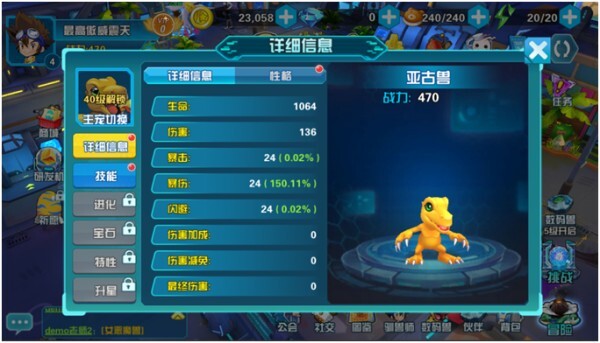 点击数码兽图标即可进入对应的界面,在该界面中能够查看每只数码兽的属性信息与技能详情。