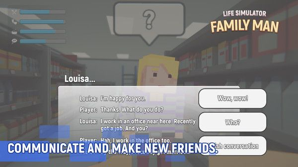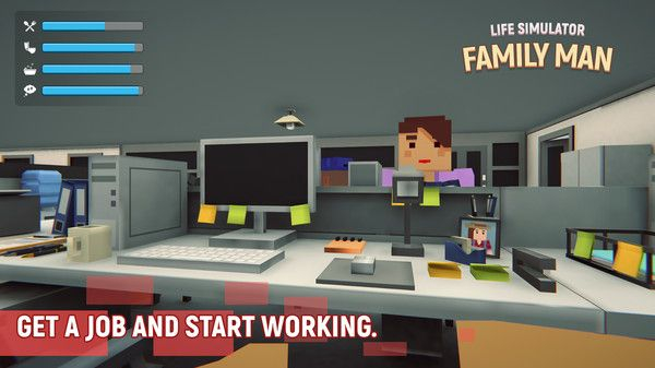 这款以方块世界为背景的模拟生活游戏里,充满了紧张又丰富的经营挑战场景。故事围绕一位顾家的父亲展开:他所在的公司突然倒闭,为了支撑家庭开销,他不得不借下了利息高昂的贷款。然而家人对此并不知情,更无法理解他的处境,彼此间的关系也逐渐变得疏离。现在,玩家需要一边想办法持续赚钱偿还贷款,一边努力修复与妻子和女儿之间的感情裂痕。