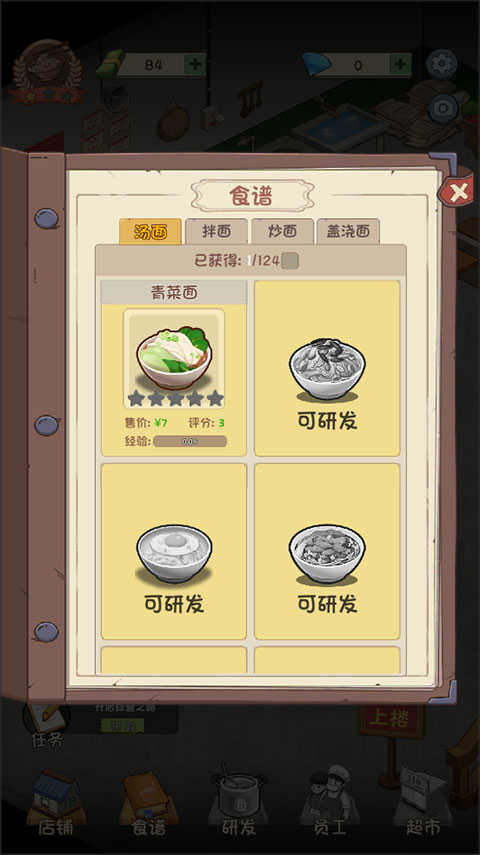 1、爸爸的面馆里食谱评分想要升级,一方面是通过研发获取新食谱,再用这些食谱来提升熟练度;另一方面,持续售卖对应的面也能增加熟练度。