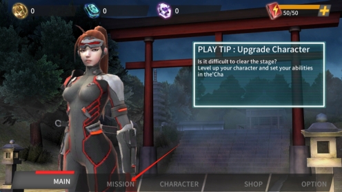 1、在游戏主界面,按照箭头指示的方向,点击MISSION按钮,进入任务选择界面后,点击开始游戏选项。