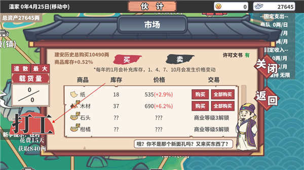 5、开启商业活动需要先拥有20000两,因此首先得通过打工来积累资金。每次打工都会消耗游戏内的15天时间,但不用发愁,只要随便打几次工,就能得到神秘女子的资助。