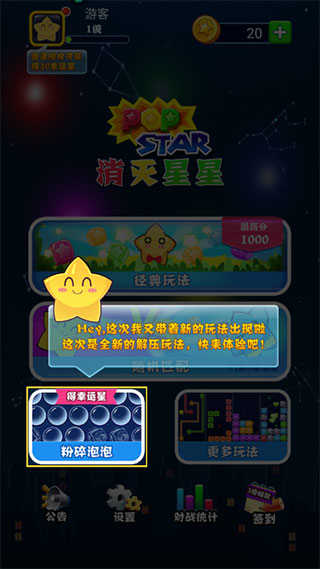 6、消灭星星全新版还提供了粉碎泡泡等多种游戏玩法可供选择;