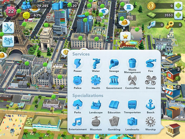 6、为您的市民配备发电站、警察局等公共设施以满足其生活需求,同时增设公园与教育资源来促进人口增长。