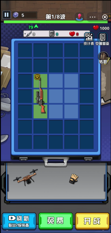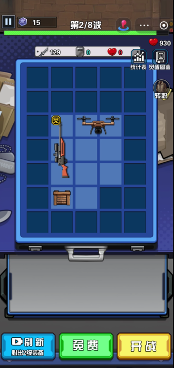 拖曳下面的武器到中间的九宫格中,直到九宫个武器填满了或者不能继续拖曳了,就直接开战吧。如果玩家游闲情的话可以点击免费,这个是看广告解锁全部的武器宫格的。