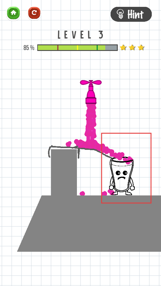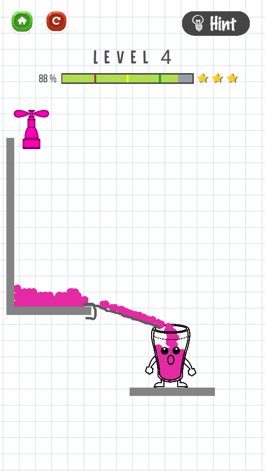 1、用手指在屏幕上画线条,引导粉色水流避开障碍物,准确流进杯子里,线条的形状要和水流的路径相匹配。