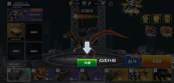 8、此外,玩家也能在首页的恐龙选择界面里自由挑选想要出战的恐龙,还可以对心仪的恐龙进行升级操作,升级后的恐龙在战斗力方面会有显著提升哦