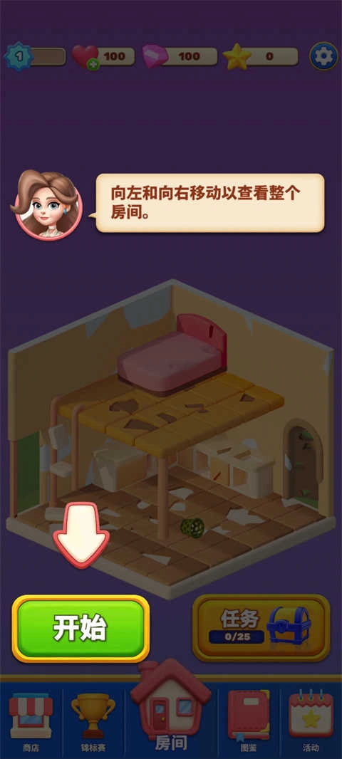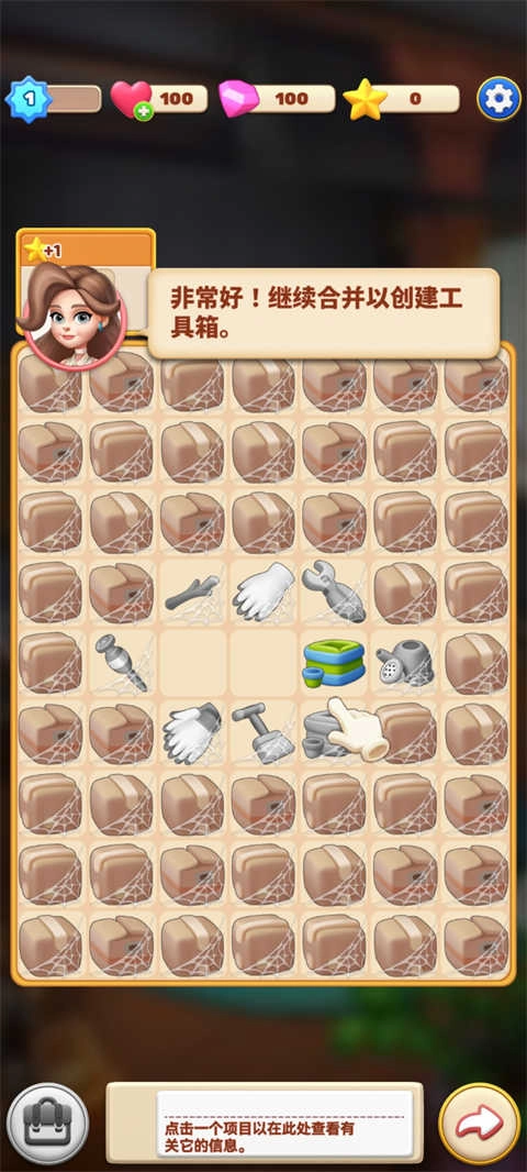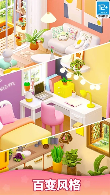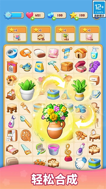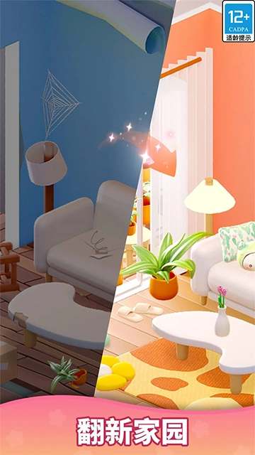 将拼图游戏板上的两个相同元素合并,创造新的物品和工具,以翻新客厅、卧室、厨房、花园和温室等各种房间;