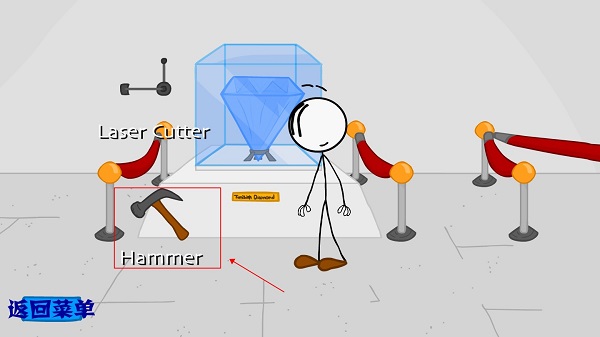 接下来要解决的是打开存放钻石的柜子的问题,选用锤子作为工具,通过敲击将柜子打开并获取里面的钻石。拿到钻石之后,下一步需要考虑的是如何离开当前的空间。