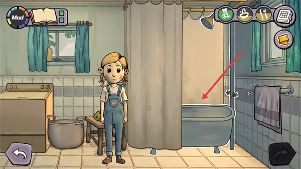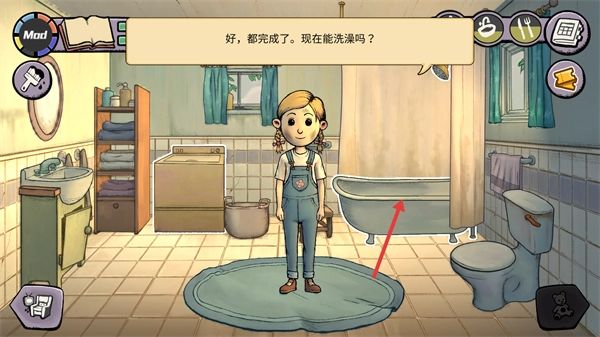 3、进入浴缸区域后,根据提示再次点击浴缸,就能进入浴缸洗澡了。