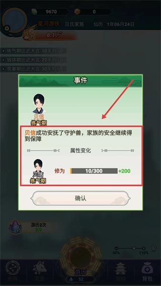 2、选【贝信】处理守护兽事件可成功安抚,提升其修为,增强成员实力,为后续发展铺路。