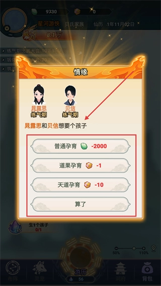 3、情缘界面优先选【普通孕育】,消耗资源少且稳定传承,助力家族长久延续。