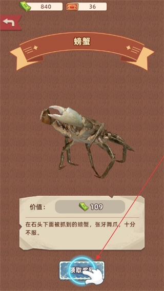 4、挖掘出螃蟹道具后,先查看它的价值,再点击领取按钮,即可获得该道具以及对应的资源。