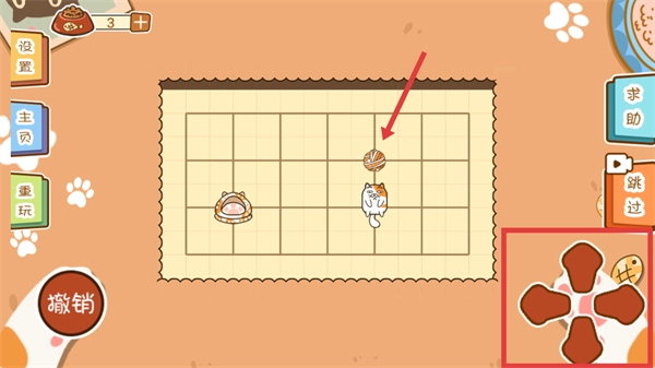 2、关卡内使用方框内【虚拟按键】操控猫咪移动,将箭头所指【毛绒球】进行推动。