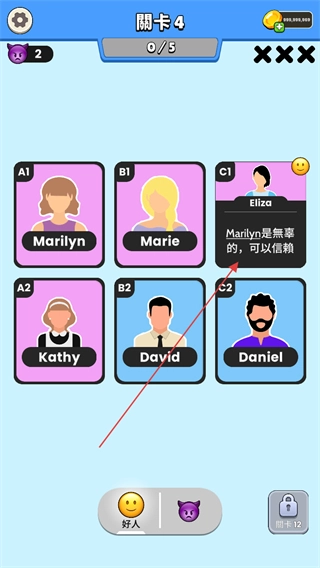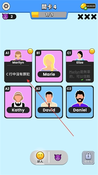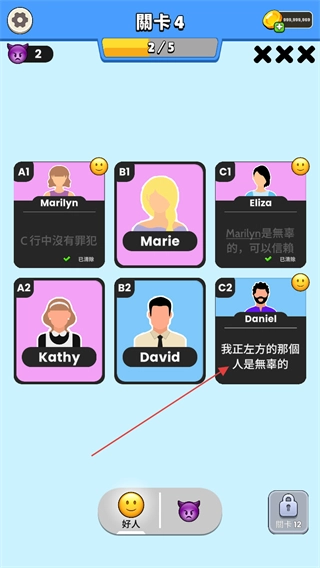 3、点击Daniel卡片,根据其线索正左方的人是无辜的,继续识别好人。