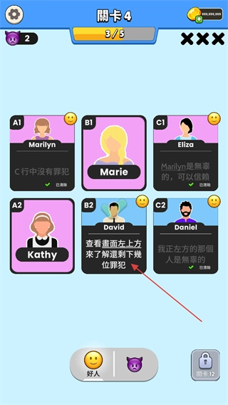 4、点击David卡片,根据其线索,标记为好人,逐步找出所有好人,完成关卡。