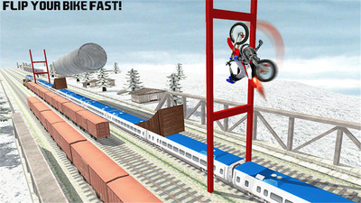 在疾驰的列车顶部,一场惊心动魄的极限摩托特技对决正在上演!玩家通过屏幕上的虚拟按键,便能操控摩托骑手完成各种高难度动作,感受风驰电掣间的流畅操作与肾上腺素飙升的刺激体验。