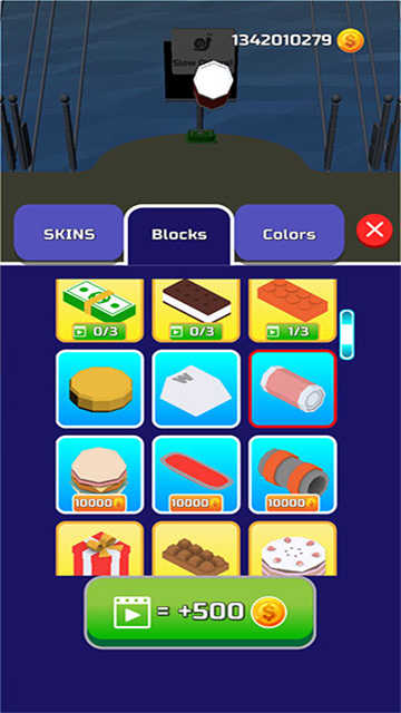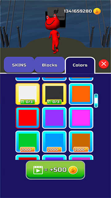 3、上方第一栏位角色模型,第二栏为砖块样式,而第三栏为角色皮肤颜色,大家根据自己喜好解锁即可(解锁方式为点击直接解锁,最下方按钮为看广告加金币的按钮,部分物品可以通过金币点击购买,而部分物品需要观看多次广告以及付费购买)