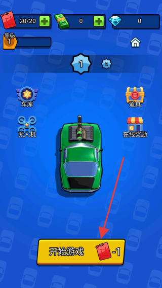 1、点击“开始游戏”按钮,消耗1个道具就能进入游戏场景,开启紧张刺激的赛车战斗之旅。