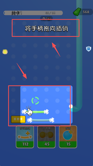 2、点击屏幕使管道发射小球,调整好角度,让小球触碰到绳索、风扇等道具,借助这些道具改变方向,从而完成弹射过程。