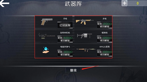2、在武器库中选择你的武器之后,点击继续。