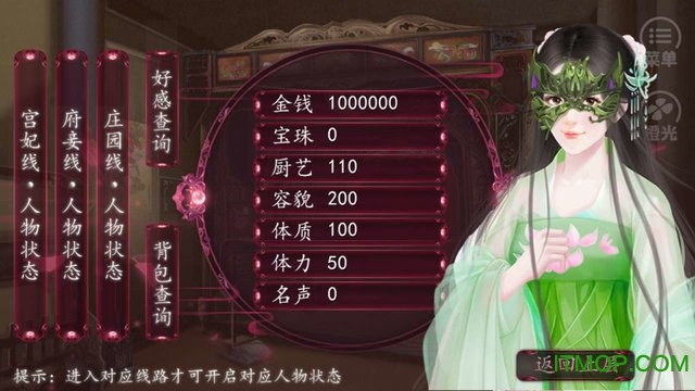 1厨艺比拼结束后选择钻研厨艺方向,需满足身体素质达到70以上、烹饪技艺超过110分、外在容貌数值不低于200的要求,对应可进入已完成创作的宫廷后妃故事线。