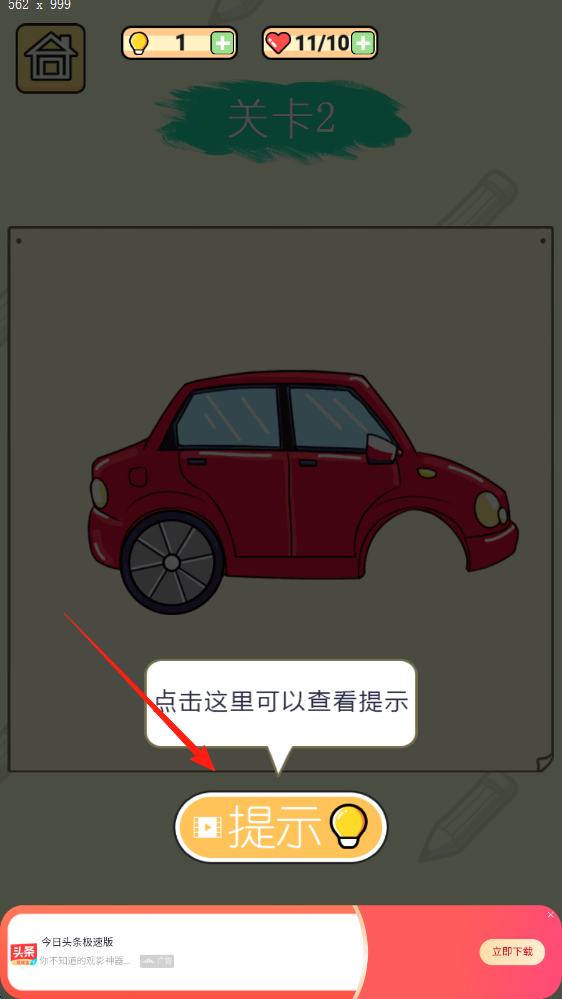 3、在关卡2遇到困难时,可点击提示按钮,通过观看视频或获取线索,完成汽车补全操作。