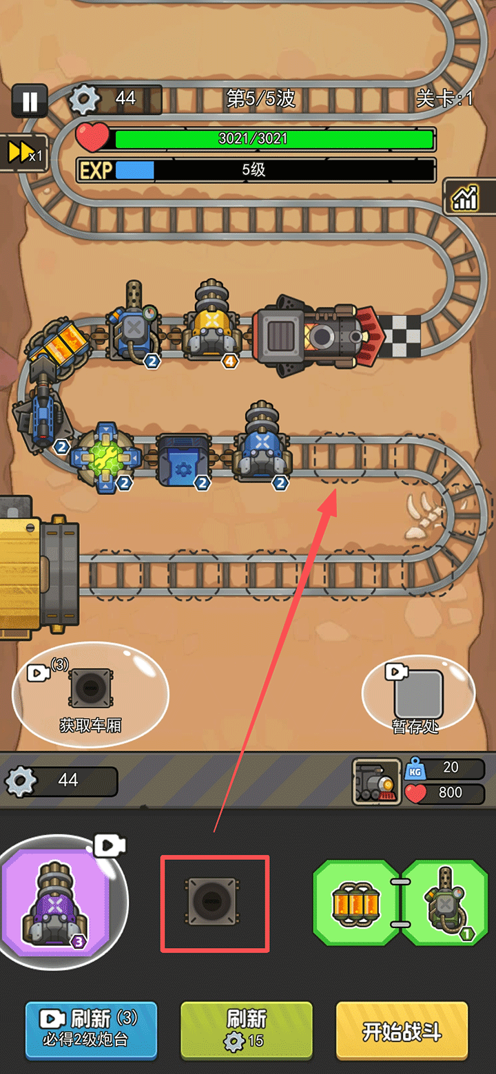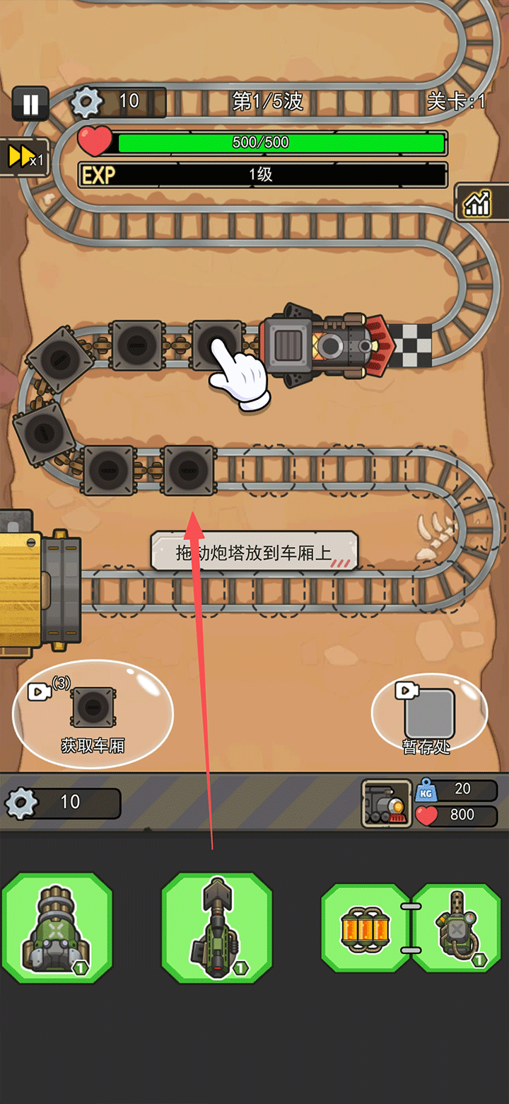 1、进入关卡后,将底部炮塔拖动到车厢上进行部署。